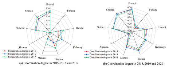 The coupling coordination degree was calculated based on the CCDM for the main urban areas of the major cities in the study area. Figure 9a,b shows that the coupling coordination degree of urbanization and ecological environmental quality in the main urban areas of the nine major cities from 2015 to 2020 exhibited an increasing trend, with an average increase from 0.221 in 2015 to 0.239 in 2020. Among them, the coupling coordination degree of Urumqi City, Changji City, Shihezi City, Kuitun City, and Kelamayi City was higher than that of the other cities. This indicates that the coupled coordinated development of urbanization and ecological environment has improved from 2015 to 2020; however, it is still characterized by moderate imbalance and a level of gradual urbanization. Therefore, although the urbanization and ecological environment of cities in UANSTM are changing rapidly, the coupling coordination between the two remains at a low level. Moreover, ecological environmental quality is changing at a faster rate than the development of urbanization and they have not reached the stage of coordinated development.