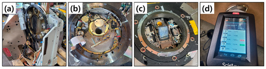 Components, including the head of three decommissioned medical linacs, were analyzed. Particularly, the linacs investigated were Clinac iX (Varian), AgiltyTM (Elekta), and Oncor Expression (Siemens). The study focused on the parts of the linac head that are prone to activation in terms of the beam pathway, which included the target, primary collimator, ion chamber, jaw (MLC), and bending magnet. To confirm the components of each dismantled linac head part, laser-induced breakdown spectroscopy (LIBS) was used. Surface investigation was conducted at least three times for each part using a portable LIBS element analyzer (Z-300 GeoChem Pro, SciAps Inc., Woburn, MA, USA). The results of the measurements were then compared with the specifications provided by each manufacturer, and the levels of impurities were analyzed. Figure 1a–c shows the process of dismantling the linac head parts manufactured by Varian, Elekta, and Siemens, respectively. Figure 1d shows the portable LIBS device measuring the emission from each major component of the dismantled head parts.