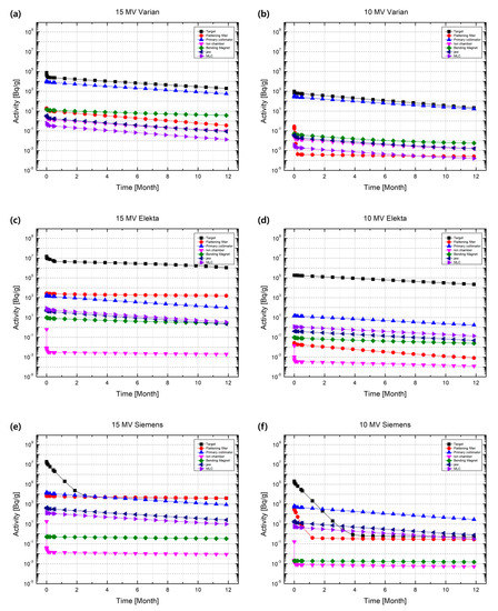 Time-dependent changes in the activity levels of the linac major parts obtained by applying a workload of 80 Gy/day at the energy levels of 15 and 10 MV: (a) 15 MV Varian; (b) 10 MV Varian; (c) 15 MV Elekta; (d) 10 MV Elekta; (e) 15 MV Siemens; and (f) 10 MV Siemens.