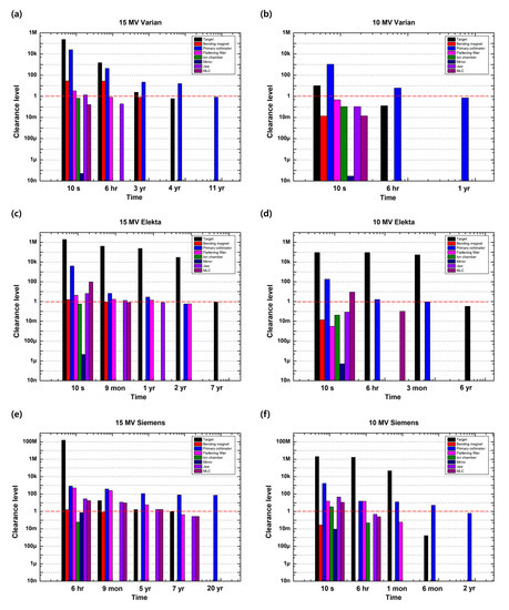 Clearance level by part and by equipment (15 MV/10 MV linacs of three manufacturers), applying a workload of 80 Gy/day (dotted red line: reference clearance level of 1; self-disposal is allowed at the activity level below this line): (a) 15 MV Varian; (b) 10 MV Varian; (c) 15 MV Elekta, (d) 10 MV Elekta; (e) 15 MV Siemens; (f) 10 MV Siemens.