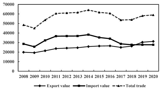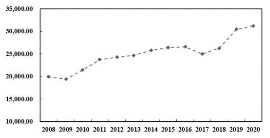 The sample for this study consisted of 18 HS-coded biomass energy products, and all the data were taken from the United Nations Statistical Office Trade (UN Comtrade) database. In this study, we chose data on the export of biomass energy from the RCEP countries and the rest of the world from 2008 to 2020. We then analyzed the overall trend of the total export of biomass energy from the RCEP countries. The results show that over the past 13 years, the export trend of biomass energy products from RCEP countries has been decreasing, then increasing, then decreasing, and finally showing an increase (Figure 4). Therefore, we used four study periods in this work: in the first stage (2008–2009), due to the financial crisis, the export value of biomass from RCEP countries dropped significantly; in the second stage (2009–2016), with the gradual and slow recovery of the world economy, the export trade of biomass from RCEP countries showed a gradual increase again; in the third stage (2016–2017), RCEP countries’ biomass export trade volume was on a downward trend; in the fourth stage (2017–2020), RCEP countries’ biomass export trade volume turned from a downward to an upward trend. Due to the small quantity of data on biomass products exported by Brunei, Myanmar, Laos, Philippines, Cambodia, and Indonesia, these countries were not included in this CMS model.