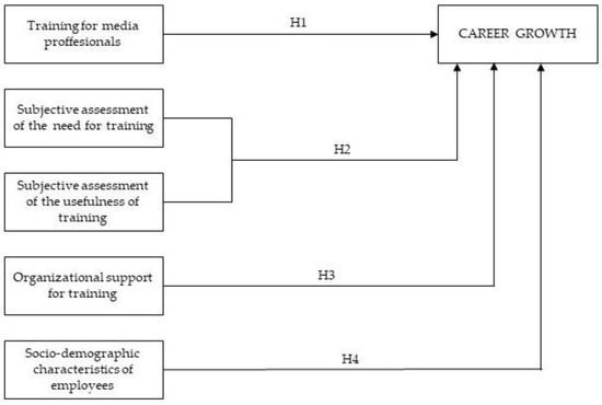 The literature on media organizations emphasizes that traditional ways and practices are not enough to provide media professionals with the opportunity to deal with the amount of information at their disposal, especially due to social media. This indicates the need to use new knowledge and tools on the basis of which to ensure smooth work for media professionals, which implies additional training and on-the-job training [30]. On the other hand, it has become necessary that the training for journalists include different types of interactive courses that enhance team and individual career growth through the development of skills for recognizing video, text, audio, graphics, and other content [31]. Taking into account the need for media professionals to improve through additional training in order to achieve career progress, the first of four hypotheses was proposed: