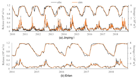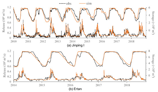 Figure 3. For the Jinping I Reservoir, the accuracy of the operation simulation is rather satisfactory for the conceptual operation scheme, with a daily NSE value of 0.90 over the entire period. For the Ertan Reservoir, the daily NSE value over the entire period is 0.84, and the NSE in the validation period (0.83) is not much lower than that in the calibration period (0.86). The root-mean square error (RMSE) is also analyzed, and the results show that the daily RMSE values of the simulated storage and simulated release are 3.5 × 10