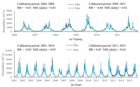 Figure 5 presents the calibration and validation results with the relative bias (RB) and the daily NSE. It shows that the performance of the CLHMS model without reservoirs is fairly good, and that most of the NSE values are higher than 0.80. Notably, the NSE in the validation period of 2011–2015 at Ertan (0.64) is lower than that in the calibration period of 2001–2010 (0.86). This could be a result of the reservoir construction upstream of the Ertan station during the validation period; reservoir operation could significantly alter the hydrologic regime, which cannot be accurately depicted by the CLHMS model without reservoir representations.