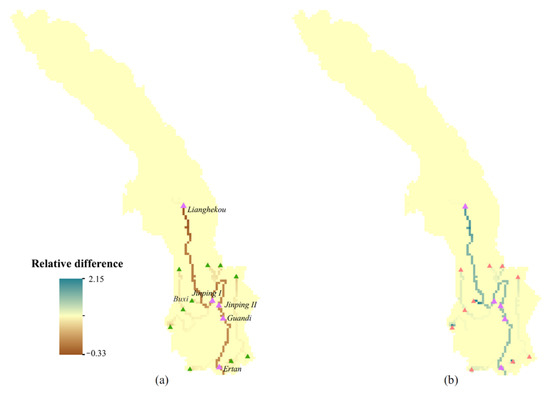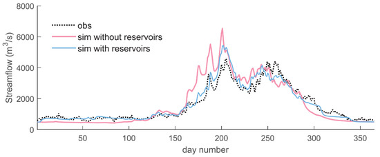 Figure 6. Note that the reservoir in the model is activated only after the model reaches the time point at which that reservoir was put into full operation in reality. It means, for example, that the Jinping I Reservoir was deactivated until 2013 and the Lianghekou Reservoir was never activated during the calibration and validation period of the model. In general, it is found that coupling reservoirs to the hydrologic model using the reservoir operation scheme can improve the model performance in the river flow simulation during the validation period, as the daily NSE at Ertan is increased from 0.64 to 0.81 during this period. This indicates that, in addition to reproducing the dynamics of the selected reservoirs in the basin well, the CLHMS model with the reservoir operation scheme can serve as a reliable tool to understand the hydrological impact of reservoirs.
