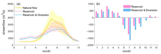 Reservoirs across the YRB are able to effectively modulate the flow regimes by reducing the peak flows in the wet season and increasing the low flows in the dry season for enhanced water security conditions of the basin. With the further impact of water diversion, the river section between the diversion reservoirs and the Lianghekou reservoir is expected to experience a relatively large decrease in the streamflow in both dry and wet seasons, in comparison with the natural condition; this calls for preservation measures in the ecosystem. For areas downstream of the Lianghekou Reservoir, the diversion-induced decline in the streamflow in the dry season is likely to be fully mitigated by reservoir operation, as the streamflow in the dry season can be increased to a level 38–51% higher than the natural flow conditions. The streamflow in the wet season can be further reduced, which could benefit the flood control further downstream.
