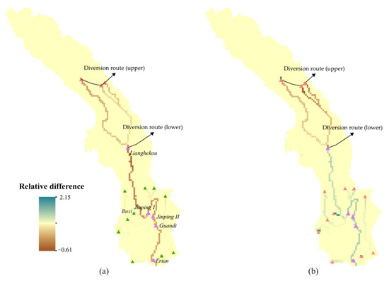 Despite a dozen more hydropower reservoirs being constructed and planned in the mainstream, none of them are designed for streamflow regulation at daily scales due to their small capacity. Therefore, the five mainstream reservoirs and ten tributary reservoirs included in this study are expected to mostly represent the effect of damming on the flow regime of the YRB in the near future. That being said, the Reservoir scenario can be assumed to represent the human impact on the hydrologic regime of the YRB for the period from the full operation of the Lianghekou Reservoir (expected in 2024) to the completion of the water diversion project (no exact date so far); in addition, the Reservoir and Diversion scenario is expected to reflect the human impact on the hydrologic regime of the YRB after the completion of the water diversion project.