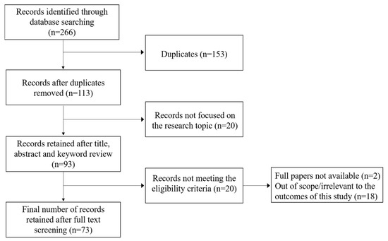 According to the described steps, a total of 266 references were identified from Scopus and Web of Science. After 153 duplicates were removed, 113 records were screened based on the title, abstract, and keywords. From these, 20 records were excluded as they were not related to the research topic. This included some studies where the term “green wall” was not related to VGS but to the Great Green Wall tree-planting initiative in the Sahel region, as well as studies focused on the water needs of plants, greywater treatment to irrigate plants, fungal and bacterial dynamics in green walls, and lifecycle assessment of plants, among other topics. Thus, 93 records were assessed for eligibility by full-text screening. The full-text screening excluded two records that we were unable to be retrieved due to a lack of full access to the paper, while a total of 17 records were excluded because they were out of scope or irrelevant for the goals of this review. This mainly includes records in which the searched terms used in the title, abstract, or keywords were not explored in depth in the papers. Therefore, 73 records were eligible for review.