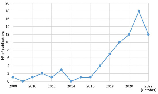 The 73 eligible records were published between 2008 and 2022, but the searched topic has gained increasing attention over the last four years, which was when 71% of the documents were published (Figure 2). All the retrieved documents were published as articles in a total of 45 journals. Research into VGS has been published in various subject areas, including environmental sciences, engineering, planning, material sciences, and social sciences. The journals with the most publications are Building and Environment (10 publications), Urban Forestry & Urban Greening (7), Journal of Cleaner Production (4), and Sustainability (4).