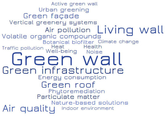 The 73 documents contain about 400 keywords. From these, the keywords with more than 10 occurrences are: “green wall” (this appears in 31 documents), “living wall” (17), “Green infrastructure” (15), “air quality” (13), and “green roof” (12). The remaining keywords with more than four occurrences are shown in Figure 3.