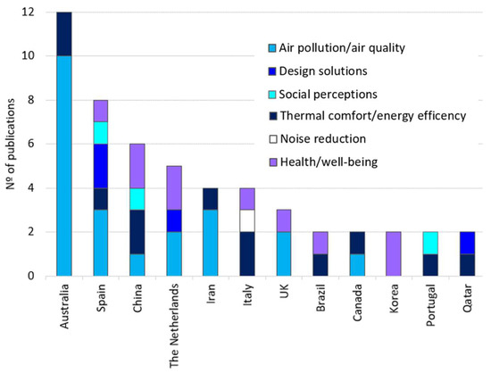 The countries with two or more case studies are shown in Figure 4. Research into the searched terms has been most popular in Australia, Southern Europe countries (Spain, Italy, and Portugal), China, and Middle Eastern countries, indicating that these studies have been mostly conducted in areas with hot, subtropical, and Mediterranean climates. As shown in Figure 4, thermal comfort/energy efficiency, air pollution/air quality, and health/well-being have been the most studied topics in these countries.