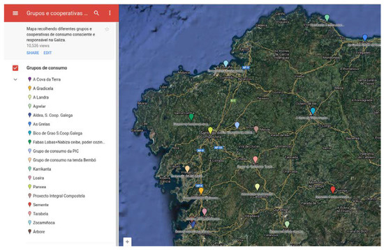 This study is contextualized in the Galician region (Spain). Specifically, the consumption initiatives that are part of the so-called “conscious and responsible consumption network” were studied as a manifestation of citizen engagement in the Galician food movement. This informal network, which is formed by twenty-five collective food buying groups and cooperatives, engages a total of 1500 families across the region (see Figure 1, below). These citizen-led initiatives are formed by consumers that collectively organize their food purchases by establishing agreements with farmers and local producers, with whom they establish regular deliveries of seasonal products [38,39]. Adopting different organizational and legal formulas (food coops, non-profit associations, and informal consumption groups), the Galician conscious and responsible consumption initiatives claim to promote the consumption of organic and locally produced food, as well as other fair trade and solidarity products. They usually share common principles and values aligned to the social and solidarity economy and food sovereignty movements. These local initiatives define themselves as transformative projects that aim to build, at the local level, a more egalitarian, fair, sustainable, and more democratic food system [38,39].