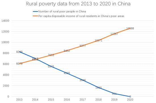 The Chinese government has made significant efforts towards reducing poverty through targeted education services, integrated industrial development services, transfer employment and the relocation of industries in inhospitable areas. From 2013 to 2020, there has been a decrease in poverty levels in rural China, as shown in Figure 1. However, the elimination of traditional poverty is still ongoing, and ongoing efforts are necessary to sustain these gains and prevent the emergence of new forms of poverty in the digital era. This includes ensuring equal access to the benefits of Internet development for both urban and rural residents. Despite advances in the economy and society, digital poverty remains an issue, particularly in rural areas where unequal distribution of resources and backwardness contribute to its growth [1].