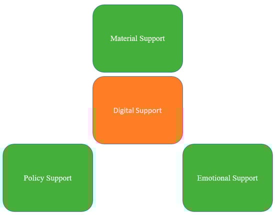 The connotation of social support served as the foundation for this research project’s understanding of digital support. According to [21], the term “social support” refers to an individual’s perception of the general or specific support actions taken by others within their social network. These actions have the potential to improve an individual’s ability or reduce adverse outcomes for them. According to this research, social support includes feelings such as trust and love. The term “digital support” refers to the comprehensive social support that digital users are able to acquire in the information environment or should strive to obtain. This research argues that digital assistance consists of three levels, as suggested by earlier viewpoints [22]: material support such as space equipment, policy support such as training information and emotional support such as encouragement of caring and attraction, as shown in Figure 6.
