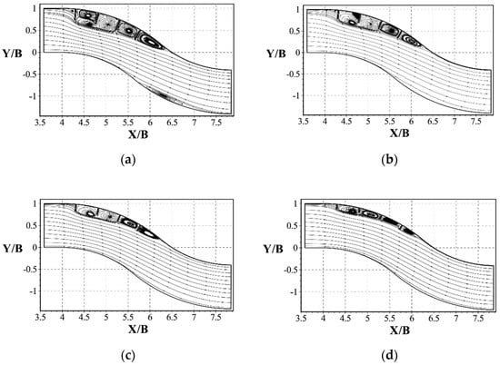 Figure 7 shows the 2D time-averaged streamlines at for cases 1–10. After the groynes were arranged, different vortex systems were observed in the groyne fields. It can be seen from Figure 6(I, b) and Figure 7a that for case 1, the flow entered from the downstream of the first groyne field, and the positive transverse velocity was distributed along the diagonal. There were two side-by-side vortexes; one was the primary vortex rotating counterclockwise at the interface, and the other was the secondary vortex rotating clockwise near the riverbank. In the second and third groyne fields, the flow entered from the downstream of the interface and escaped from the upstream, producing only one vortex. The vortex system in groyne fields at channel bends was different from that found in a straight channel by Weitbrecht et al. [16]. With the decreased groyne length (cases 2–4), the flow structures in the first groyne field change (Figure 7b–d). The secondary vortex became smaller in case 2 and disappeared in case 3, and the all groyne fields presented a single-vortex system state. From Figure 6(V, b) and Figure 7e, for the three groyne fields in case 5, the flow entered from the middle reach of the interface and escaped from both sides, thus creating a double-vortex system. The center of the primary vortex was located in the shear layer with complex flow structures, which made the exchange process between the groynes arranged in descending order and the mainstream complicated. In case 6 (Figure 7f), similar to case 3 and case 4, the three groyne fields presented a single-vortex system state. As shown in Figure 7g–j, the changing of the orientations only affected vortex position in the groyne field of the groynes arranged in descending order but had no obvious effect on the groynes arranged in ascending order. Furthermore, cases 1, 5, 7, and 8 exhibited flow separation on the outer bank of the first half in Bend 2 and formed a recirculation zone. As mentioned above, this is caused by the long groyne aggravating the flow so that it cannot be fully developed in the short bend.