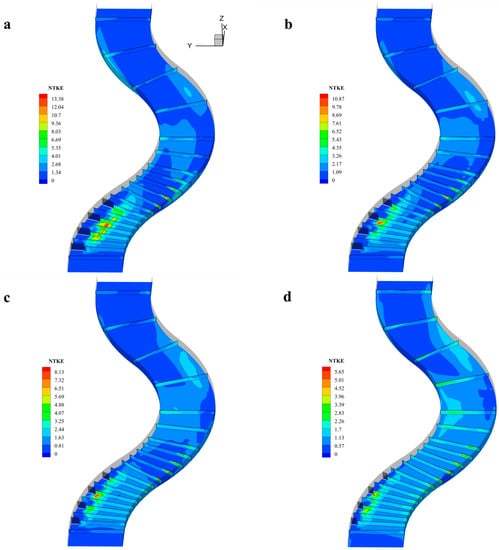 Turbulent kinetic energy represents the degree of turbulence of fluid. High turbulent kinetic energy indicates that the degree of fluid collision and friction is more intense. The Normalized Turbulent Kinetic Energy (NTKE) is calculated as follows [36]: