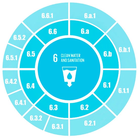 The Sustainable Development Goals (SDG) were adopted in 2015 by the United Nations (UN) members as a way to end poverty, protect the planet and guarantee sustainable development by 2030 [1]. Each SDG comprises targets whose fulfillment is measured through indicators. SDG 6 is commonly known as the water and sanitation SDG, but also includes targets that aim to measure the social, environmental, and economic role of water. This SDG comprises eight targets which comprise 11 indicators altogether, as shown in Figure 1 and Table 1.