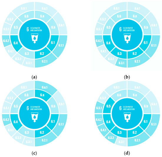 Figure 2a–c illustrate that none of the previous studies included all of the targets proposed by the UN. As a matter of fact, none of them quantified targets 6.5, 6.6, or 6.b. Target 6.a.1 was only measured by Pereira and Marques [6]. In addition, as said before, the Consejo has only reported six indicators that partially allow for the measurement of five targets, as shown in Figure 2d. Therefore, it is illustrated that none of the previous studies on this topic holistically and locally assessed the progress made in achieving SDG 6 in Chile or other countries, which could lead to countries not knowing their situation in deep terms, but rather only their rank compared to other countries. This approach is essential to systematically monitoring the progress made in the achievement of SDG 6 and adopting specific policies to implement the 2030 Agenda.