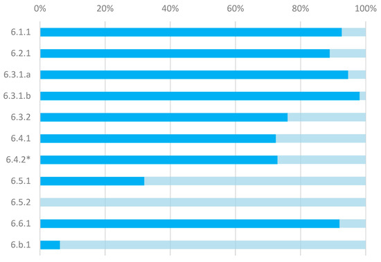 Figure 4 shows the level achieved by the indicators as a proportion of the aspiration level. Indicator 6.4.2 was inverted so that aspiration level was 100% and not 0%. Note that indicators from 6.1.1 to 6.3.2 and 6.6.1 are beyond a 75% level of achievement.