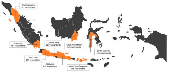 The selection of study sites within the 8 provinces involved a multistage-random-sampling approach. Within each province, 1 district with the highest agricultural GDP was determined and 1 district with a medium agricultural GDP was determined. From each selected district, 2 sub-districts and 2 villages were selected, based on their having the largest agricultural area within the sub-district and village. The selection of respondents at the village level was carried out randomly, ensuring that respondents were not located close to each other. This sampling approach resulted in a total of 1341 respondents, spread over 16 districts, 32 sub-districts, and 64 villages. The number of respondents in each province and district is shown in Table 1.
