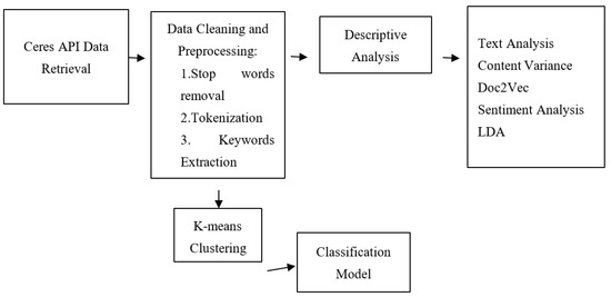 This text-analytics-based research study delves into the sustainability disclosures of companies to understand the expansive sustainability issues, practices, and trends. The origin of the disclosures’ data is the website of Ceres, a sustainability-focused, non-profit concern that has made available several searchable databases (https://tools.ceres.org/resources/tools/sec-sustainability-disclosure/ (accessed on 1 September 2021)) that offer a rich source for analysis. According to Ceres, its SEC Sustainability Disclosure Search tool can assist in gaining insight into how companies handle the perils as well as the benefits that may arise from issues such as climate change, carbon asset risk, water availability and quality, and hydraulic fracturing (ceres.com). Their tool searches the text of SEC annual filings (10-K, 20-F, and 40-F) and readily identifies pertinent disclosures. According to Ceres, it then distinguishes the information, identifies the location of the disclosure in the filing, and makes it all available in the searchable database (ceres.com) [84,85]. To this end, our data are from a legitimate source, namely the Securities and Exchange Commission, a government entity. The database makes it easy for researchers to access the disclosures via an API and be able to analyze the large amount of text data to gain insight into corporate sustainability practices (https://www.ceres.org/resources/tools/sec-sustainability-disclosure-search-tool (accessed on 1 September 2021)). Such a tool is also useful to investors and other stakeholders interested in knowing more about the opportunities and risks presented by climate change and other ESG issues in companies. According to Ceres, these disclosures in the SEC filings can be compared with the voluntary disclosures that are made via other channels, such as those made to non-profits. To reiterate, machine learning and text analytics together offer powerful analytical tools to interpretand study a large corpus of textual data in a productive way [26,32,83]. The understanding accrued from the study would guide top executives, shareholders, institutional and individual investors, and watchdogs to make informed decisions. The text data were retrieved using the Ceres API, and they were cleaned using advanced data-cleansing methods. Preprocessing steps were then applied. However, we focused only on the disclosures relating to climate change risks filed between 2011 and 2020. The API-enabled disclosure information, such as the company name, division, industry, year, and ticker, and the disclosure content were all in JSON format. Therefore, Python was used to extract all file name numbers and climate change risk disclosure content, where available. Data were retrieved as of 30 September 2020. There were a total of 53,418 files (disclosures) provided by 5347 companies. However, only 48% of the files mentioned climate change risks. So, machine-learning-based text analysis techniques were applied only to those 25,428 files. First, we conducted descriptive data analysis to obtain a panoramic view of the disclosures. Next, we conducted topic modeling and other text analytic methods. For example, we constructed the term frequency–inverse document frequency (TF-IDF) model and K-means to group industries with similar foci. Figure 1 outlines our overall research methodology.