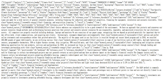 Likewise, it was observed that all disclosures follow the same structure in the Ceres API. For example, Figure 2 shows the disclosure information for the company 1ST SOURCE CORP in 2017, which is under the “Banks and Financial Service” industry group and the “Finance, Insurance, and Real Estate” division. It also shows all disclosure contents related to climate change for the company in the 2017 annual filing.