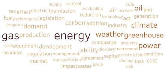 As shown in Figure 3, the darker the color and the larger the size, the more frequently the word appears in the overall disclosure report. It is obvious that energy-related words, such as gas, emission, power, and oil, formed a substantial portion of the content. Climate-change-related words, such as greenhouse, ghg, water, air, and carbon dioxide, were also quite significant. Furthermore, regulation-related terms, such as legislation, compliance, regulation, and agreement, were prominent as well.