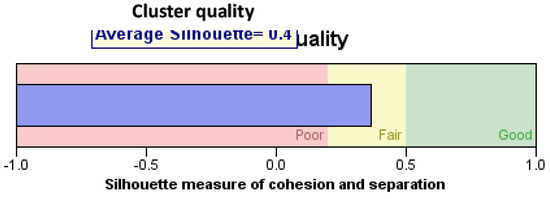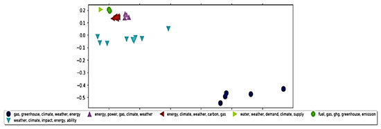 In Figure 6, the taxonomy of clusters and keywords is displayed. The six different clusters are shown in different colors and shapes, and for each cluster, the most important keywords are identified. One can describe each cluster based on its keywords. The silhouette score is used to appraise the caliber of a cluster identified with the use of standard clustering algorithms, such as K-means. The issue addressed is to what degree are the observations clustered with other observations that are like one another. The value of the silhouette score varies from −1 to 1. When the score is 1, the clusters are distinct and sharply delineated. A value close to 0 indicates congruent clusters with the observations in proximity to the decision boundary of the nearby clusters. In this study, the derived silhouette score of 0.4 indicated the clusters were quite distinct.