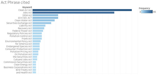 To gain insight into the regulatory aspects mentioned by companies in their sustainability disclosures, the statutes typically mentioned in terms of compliance by extracting law-related phrases using spaCy (https://spacy.io/ (accessed on 1 September 2021)), a natural language processing API, were identified. This allows one to extract chunks of text by using POS tagging annotation or a phrase pattern. For example, if one wants to extract all the adjectives followed by a noun, one can specify {POS:ADJ},{POS:NOUN} and the API will return all the matched results. Specifically, we used the matcher engine called Rule Based Matcher to perform token-based matching to find descriptive words for “laws,” “Act,” and “regulations.” We chose to extract words connected with “Act” because they were domain specific to law. For example, this gives “Clean Water Act” or “Federal Power Act” instead of vague law phrases, such as “related requirements” or “state law.” A caveat is we did not know which state. At first, POS tags were used to set the matching patterns, such as below: