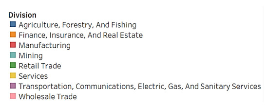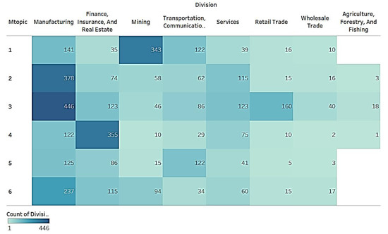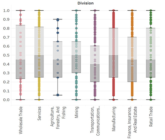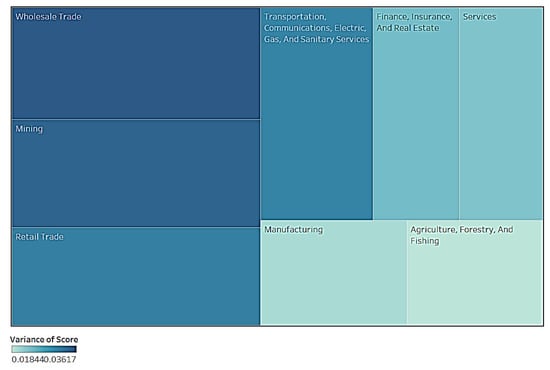The darker and larger the box, the larger the variance, and the more variant the content within that specific sector. As shown in Figure 10, the variance of Doc2Vec similarity scores was the highest in the wholesale trade sector, meaning the disclosure content of companies in the wholesale trade sector varies more from each other than from companies in other sectors.