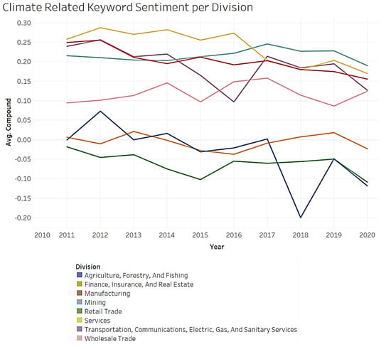 Figure 12 shows the compound sentiment score for the aspects of climate-change-related company disclosures. As shown in the chart, the compound sentiment score for agriculture disclosures dramatically decreased during recent years. This implies that the agricultural business has been severely affected by the recent escalation in climate change and that companies perceive climate change as a risk factor to their business.
