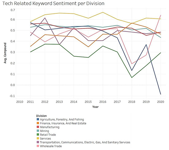 Figure 11 is a line chart showing the compound sentiment score for the aspects of regulatory-related company disclosures. As shown in the chart, the increasing trend in the wholesale trade industry implies companies in this sector have complied with laws and regulation more effectively during the recent year. The compound sentiment in the mining sector decreased from 2019 to 2020.