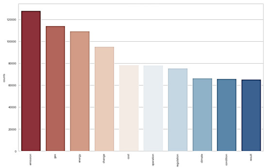 The aim of latent Dirichlet allocation (LDA) is to assist in the classification of the content of disclosures reports and find a mix of topics that companies focused on. LDA was applied to the disclosure content to elicit the key topics addressed by the disclosures [26,27]. By assigning each disclosure to a cluster, the model can glean the hidden characteristics in the text and generate labels for the supervised learning model. Since unsupervised learning models have a high degree of uncertainty, Gensim’s LDA implementation was used (https://radimrehurek.com/gensim_3.8.3/models/ldamodel.html (accessed on 1 September 2021)). This uses the variational Bayes sampling method as model 1 and mallet LDA (http://mallet.cs.umass.edu/ (accessed on 1 September 2021)), which is typically more precise than Gensim, as model 2 to conduct the cross-validation. Perplexity and coherence scores were used as evaluation standards to compare the topic models. Each disclosure content was assigned to a dominant topic as the content label. This way, one would know which aspect the specific company’s disclosure report focuses on. Based on this method, six key topics were identified and are described below. Additionally, Appendix A contains an overview of all 70 topics. It includes the most conspicuous terms in each as well as the probability of occurrence (how high is the likelihood that the specific term appears in the topic) of these terms in a topic. To tweak the models, the text was lemmatized and bigrammed/trigrammed to group related phrases into one token for the model. Moreover, to extract the most sustainability-related topics, English stop words and certain common word lists were removed from the disclosure texts. In tokenization, the sentences were split into words, all words were lowercased, and all punctuations were removed. A stop-word list was developed, and those words were removed as well. Further, lemmatization and stemming were applied again to transform the words into their granular form (e.g., “bought” and “buying” would be replaced with “buy”) so they could be analyzed as single objects. Figure 14 provides a general understanding of the focus of topics before constructing the topic model. It shows the term frequencies of the most used words in all disclosure reports. One can observe that “emission,” “gas,” and “energy” or possibly “climate change” and other environment-related words are frequently mentioned in the disclosures.
