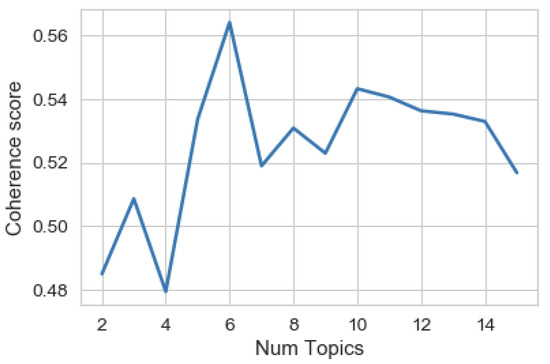 The initial model demonstrated reasonable performance, as indicated by the perplexity level, while the coherence score indicated the model needs additional refinement. Tuning is a way to maximize the performance of a model without overfitting or producing a large variance. A series of sensitivity tests were conducted to determine the number of topics (K), Dirichlet hyperparameter alpha (Document-Topic Density), and Dirichlet hyperparameter beta (Word-Topic Density). The tests were performed sequentially. One parameter was examined at a time by holding others constant. Figure 15 shows the coherence score for the number of topics across one epoch of the validation set with a fixed alpha = 0.01 and beta = 0.1. It plotted the number of topics by coherence score and studied the trend as the number of topics ranged from 2 to 15. We observed that while the coherence score was volatile as the number of topics changed, it had the best value when the number of topics was 6. As the coherence score appeared to decrease after 6 topics, K = 6 was chosen.
