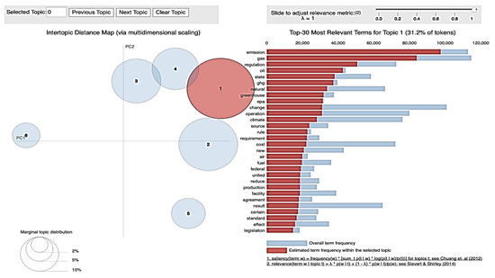 In further comparing model 1 (Gensim’s LDA) to model 2 (mallet LDA), the perplexity level and coherence scores showed nearly identical performance with similar keywords in each topic. Therefore, to scope the analysis, only the results from model 1 (Gensim) were examined further. The results in Table 6 were generated with this LDA model. Six topics were extracted along with their corresponding terms. On examination of the terms, each topic was assigned a label that most reflected the terms within. These topics and terms are indicative of the sustainability issues that companies are typically concerned with. Label categories to some extent reflect the companies’ emphasis on a certain topic. The six key topics are gas emission, carbon risk, climate change, loss and damage, renewable energy, and financial impact. When compared to the “issues” at ceres.com, the relatively common topics were climate change and carbon risk. The other topics identified in this study included gas emission, loss and damage, renewable energy, and financial impact. Financial impact was a major topic identified in this study. This is consistent with the extant literature that has emerged on the association between sustainability and company/financial performance [86,87].