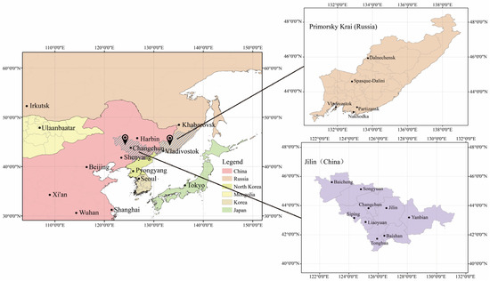 Jilin is a province of the People’s Republic of China (Figure 1). It is located near the sea and shares borders with Primorsky Krai (Russia) and North Korea. This makes it a good place for international trade and exchange. Jilin’s long-established industrial bases have an opportunity to reboom, especially with its well-developed processing and manufacturing industry. Jilin is also an important place for producing grains for the whole country. It is in the world-famous “Golden Corn Belt” and “Golden Rice Belt”. Jilin is the leading corn exporter in the whole country. In terms of international trade and economic cooperation, Jilin has officially established ties with 155 countries and regions around the world, and 89 of the world’s top 500 multinational companies have ventures in Jilin. Since the developing and opening-up strategy of the Changchun–Jilin City–Tumen pilot area was put into place, the international road transportation network has started to take shape. This network connects Russia and North Korea and spreads out to Northeast Asia. Jilin is in the geographic center of Northeast Asia and has the best conditions for cooperation with other Northeast Asian regions. Therefore, Jilin potentially dominates the cooperation between China and Russia in the region and, of course, is the best counterpart of Primorsky Krai.