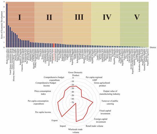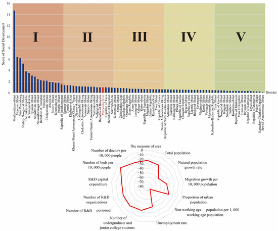 Social development potential score of Primorsky Krai and ranking of each indicator. (I—highest, II—high, III—medium, IV—low, and V—lowest).