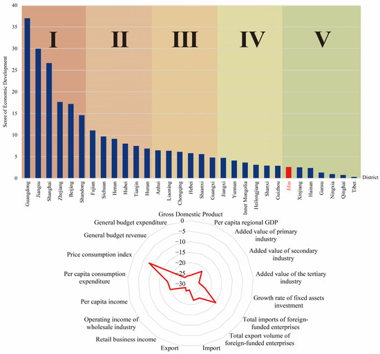 Jilin economic development potential score and ranking by indicators. (I—highest, II—high, III—medium, IV—low, and V—lowest).
