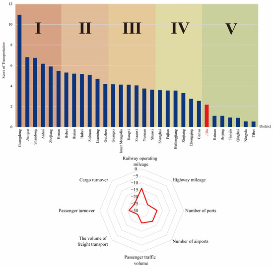 Jilin traffic development potential score and ranking of each indicator. (I—highest, II—high, III—medium, IV—low, and V—lowest).