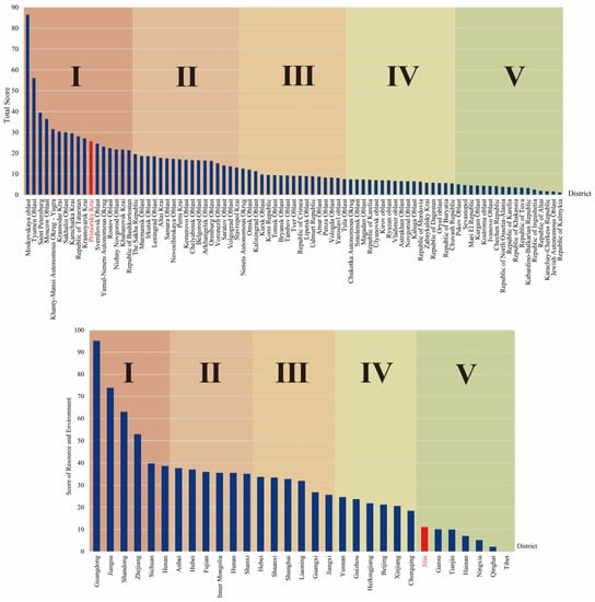 The resource and environmental development potential scores of each first-level administrative region in Russia and China were calculated individually using the regional development potential assessment (RDPA) model, and the results are shown in Figure 9 and Figure 10. Based on the RDPA scores, the researchers classified the 85 first-level administrative regions of Russia and 31 first-level administrative regions of China (excluding Taiwan Province, the Hong Kong Special Administrative Region, and the Macao Special Administrative Region) into five levels of very high, high, medium, low, and very low transportation development potential according to the quantile classification method, as indicated by different colors and labeled I, II, III, IV, and V, respectively, in Figure 9 and Figure 10. The results show that Primorsky Krai (3.621) ranks 3rd among all 85 first-class administrative regions and belongs to the administrative regions with high resource and environmental development potential. Jilin (0.935) ranks 22nd and belongs to the administrative regions with low resource and environmental development potential.