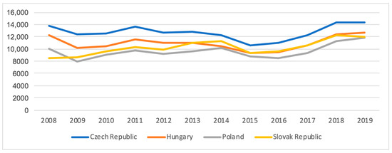 As can be seen on the graph (Figure 1), in addition to other mentioned similarities, the analysed four countries also share very similar characteristics concerning average wages in the manufacturing sector. The levels of these wages are very similar in the mentioned region. All four countries that are part of the examined region operate on the principle of open economies. The graph presented below shows the annual average wages in the manufacturing sector recalculated according to the current conversion rate in the respective year to the reference currency. This approach also offers a comprehensive picture concerning foreign direct investments and the international attractiveness of the industry and allows comparing countries by individual years. However, it is worth mentioning that nominal wages expressed in national currencies in the manufacturing sector have grown continuously since 2009 in all four countries (between the years 2008 and 2009, in all four cases, there was a decrease in average wages, even when converted to the national currency).
