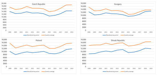 On the other hand, when comparing the average wages in the manufacturing sector and the average wages in the economy of the examined countries (Figure 2), significant differences can be noted. The manufacturing sector appears to be significantly undersized compared to the average wages in the economies of the countries, namely in the entire region of the V4 countries. Hungary seems to be the closest to equalizing wages, which, in actuality, is due to the reduction in average wages in other sectors of the economy rather than the progress of wages in the manufacturing sector.