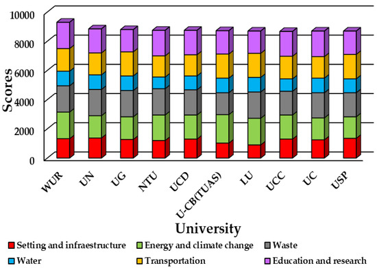 According to the 2021 UI GreenMetric ranking, the top ten universities in sustainability are the Wageningen University & Research (WUR), University of Nottingham (UN), University of Groningen (UG), Nottingham Trent University (NTU), University of California, Davis (UCD), Umwelt-Campus Birkenfeld (Trier University of Applied Sciences) (U-CB (TUAS)), Leiden University (LU), University College Cork (UCC), University of Connecticut (UC), and University of São Paulo (USP) [26]. From this list, three institutions belong to the Netherlands, two to the United Kingdom, and two to the USA. In Figure 2, the universities in the first positions stand out for their scores in the energy criteria and climate change, comprehensive waste management, and education and research in sustainability.