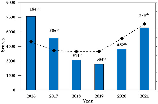 According to the UI GreenMetric in 2021, the Tecnologico de Monterrey (TEC MTY), in Mexico, was ranked in the 274th position with a total score of 6825 points, with the highest score in education and research on sustainability (1575 points) and the lowest in water management (750 points). At the regional level, TEC MTY occupies the 29th place in Latin America. Meanwhile, it ranks 11th in Mexico [14]. When historical data (scores and rankings) are analyzed, TEC MTY has been in different places since its inclusion in 2016 in the UI Green Metric (Figure 3). In the beginning, TEC MTY reached the 184th position when only 515 universities participated in the ranking. This evolved with the incorporation of more universities, rendering a lower ranking, achieving 584th place. Still, in 2020, the institution improved its position despite adding new universities to the study (956) in 2021 [26].