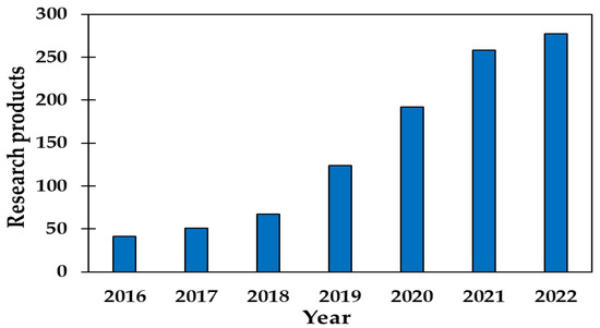 Events such as the COVID-19 pandemic modify the schedule for meeting goals. In this regard, 19% of the courses have already included SDG topics [40]. Additionally, the TEC MTY has established an Institute for the Future of Education with a research group in charge of studying the teaching–learning process, considering sustainability as a transversal competence that can be evaluated for compliance [41]. In the research dimension, an analysis in the SCOPUS database of the sustainability research products published by the TEC MTY in 2016–2022 shows that 52.3% of the products were published in 2021 and 2022 (Figure 5).