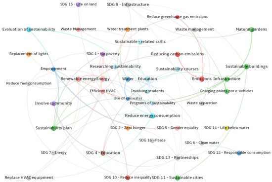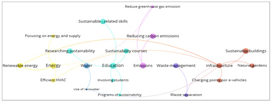 A qualitative analysis of content considering information from the initiatives and actions of the top ten best universities of the UI GreenMetric was performed. After reorganizing and summarizing the data, words were selected according to their relevance and frequency, which were recorded in an Excel file. Then, in a second Excel file, connections between words were established, and both files were fed to the VOSviewer 1.6.18® platform (https://www.vosviewer.com/ (accessed on 1 February 2023)) to create a word network (Figure 6). As observed, education and infrastructure are the main categories displaying more abundant actions. The high frequency of categories such as energy, water, and education show the most worked aspect in these universities located in the first places of the UI GreenMetric ranking. The actions about sustainable-related skills, courses, sustainability research, sustainable buildings, use of renewable energy sources, and reduction in carbon emissions were common in these universities. In the same way, less common but highlighted actions such as rainwater use and reduced green gas emissions are interesting since they create a difference in certain universities. Still, it needs to be worked on by other institutions yet.