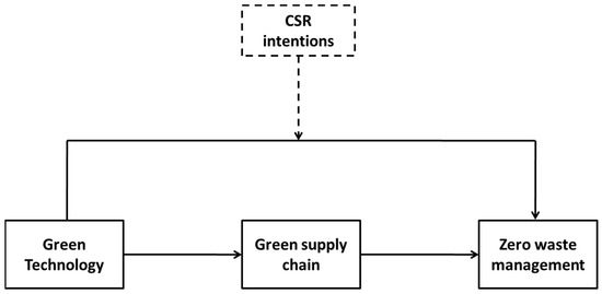 In this regard, we propose a unique empirical model that incorporates green technology, the green supply chain, and CSR intentions to determine the construction means, internal dynamic forces, and moderation constructs required to promote zero waste management in an enterprise. Previous studies examined zero waste management in different contexts, for example, as a performance measurement tool for waste management systems [19], a zero waste approach [20], and the measurement of zero waste management [21]. Green technology acts as a critical antecedent in the achievement of zero waste management. Thus, there is also a significant need to examine the green supply chain mediation and the moderation role of CSR intentions on the green technology and zero waste management links. To the best of our information, no previous study jointly investigated the effects of these variables in an empirical model.
