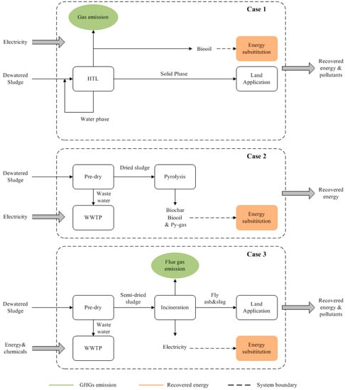 Thermochemical conversion technologies can be sorted into two groups based on their requirements for feedstock moisture content. Usually, a feedstock with a moisture content below 10wt% can be treated through incineration and pyrolysis processes. However, the pre-drying step for reducing the moisture content in wet feedstock requires a large quantity of energy, which greatly affects the GHG emissions related to energy consumption. In contrast, the hydrothermal method can deal with wet feedstock without the energy-consuming step of drying and produce similar products [30]. Therefore, three cases were selected: Case 1 (HTL), which represents non-pre-drying technologies, Case 2 (pyrolysis), and Case 3 (incineration). Cases 2 and 3 represent pre-drying technologies in different degrees.