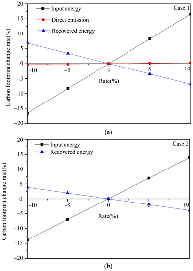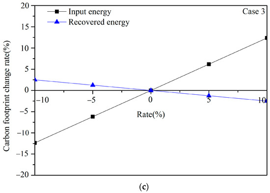 From Figure 3, it can be seen that for the three cases, the carbon footprint was most sensitive to input energy, and the recovered energy took second place. The carbon footprint was least sensitive to direct emissions. This result was consistent with the previous discussion.
