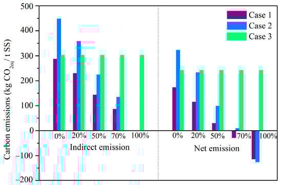 A decreasing trend of indirect emissions, as well as net emissions with carbon reduction by the electricity sector, was observed in Cases 1 and 2. When the electricity sector cut down carbon emissions by 70%, Cases 1 and 2 almost reached carbon neutrality. Case 3 had a constant indirect emission and carbon footprint due to the auxiliaryfossil energy utilization in the incineration process, such as coal and diesel. This part of the GHG emissions could not be offset by carbon reduction in the electricity sector. Therefore, the carbon emission characteristics of sludge thermochemical conversion may be strongly affected by its energy resources. With the rapid development of clean energy, thermochemical conversion technology will release great potential in carbon reduction for SS management.